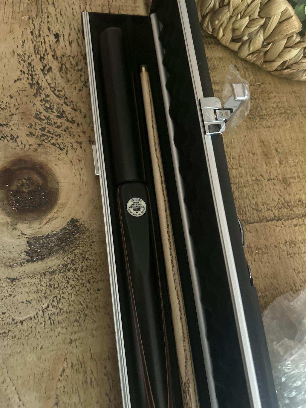 On this cue the shaft is fitted with the female section of the joint, whilst the butt is fitted with the male. Cleverly, this enables the player to remove the 16″ butt section of the cue and screw the 6″ mini butt (supplied with the cue) directly into the shaft. This makes a 47″ cue for those occasional awkward shots in restricted spaces. The butt of the cue is also fitted with a ‘quick action’ butt end joint which will also accept the 6″ mini butt supplied with the cue. This lengthens the cue to 63″ enabling the player to use the cue more easily on some shots that require a rest.